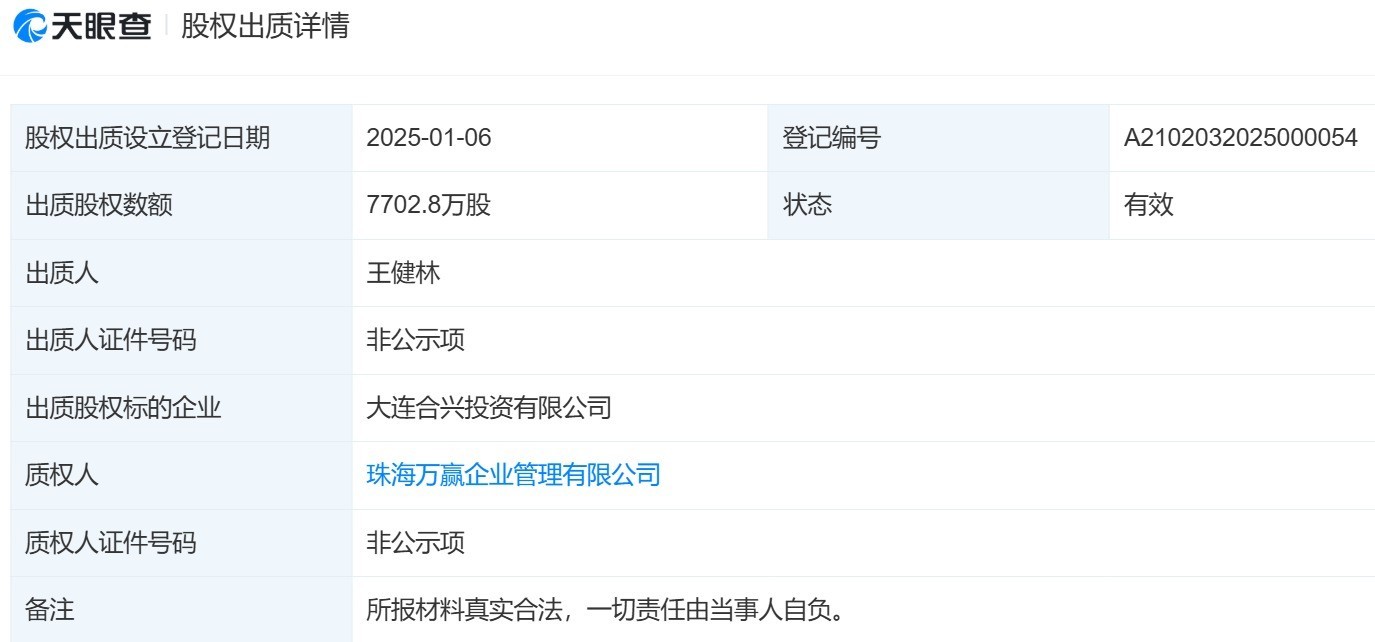 需要注意的是,王健林此次被冻结的股权,即为其此前向珠海万赢企业管理有限公司出质的7702.8万股股权。